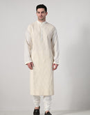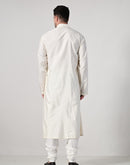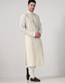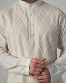 Refined and timeless, this ivory kurta features an intricate diamond-patterned embroidery on the front panel. Crafted from high-quality fabric with a sleek mandarin collar and buttoned placket, it's paired with a classic white churidar—perfect for weddings, festive gatherings, and special occasions.
