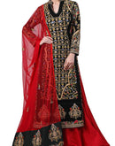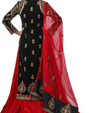 Green Velvet heavily embroidered Kurta paired with Red Lehenga & soft net dupatta detailed in sequins & zari work.