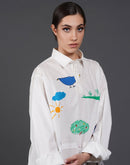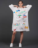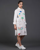 White cotton kurta showcasing abstract digital print in the front.