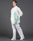White cotton shirt showcasing abstract digital print in the front.