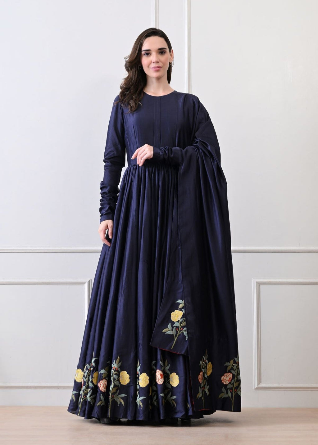 This elegant blue floor-length anarkali-style dress features full sleeves and a round neckline, offering a classic silhouette. The bodice is richly embroidered with an intricate tapestry of florals and foliage in vibrant shades...