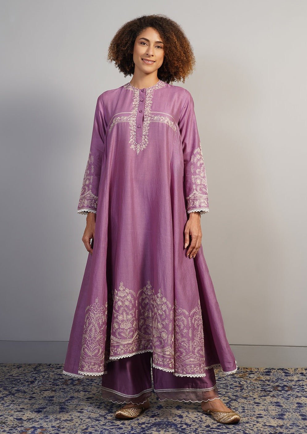 An alluring lavender, A-line, zero neck cotton silk suit set that is beautifully embroidered and decorated in silk yarn and laces. The pants are scalloped in organza at the hem. Fabric: Cotton Silk & organza silkEmbroidery ...