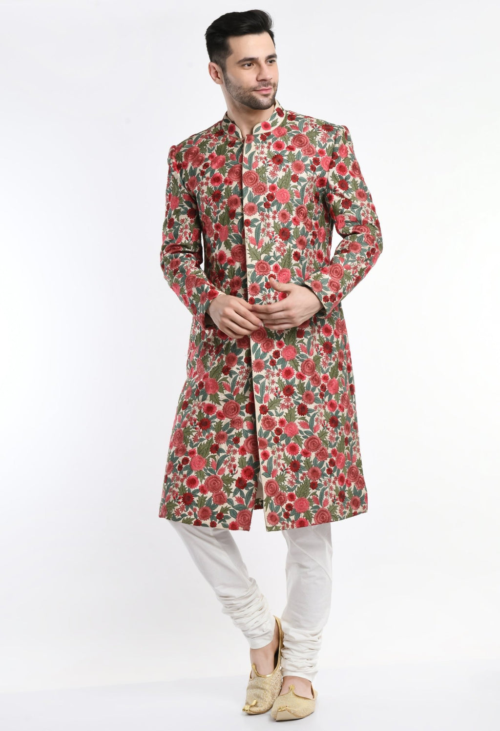 A cotton silk sherwani surfaced with intricate silk yarn embroidery paired with an ivory cotton churidar.