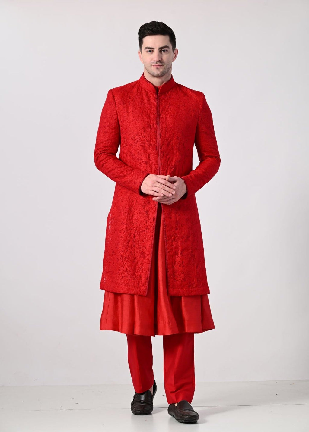 Make a bold statement with this vibrant red Indo-Western sherwani. Featuring a richly silk thread embroidery, front-slit design, and a classic mandarin collar, it pairs perfectly with matching kurta and trousers for a regal and...