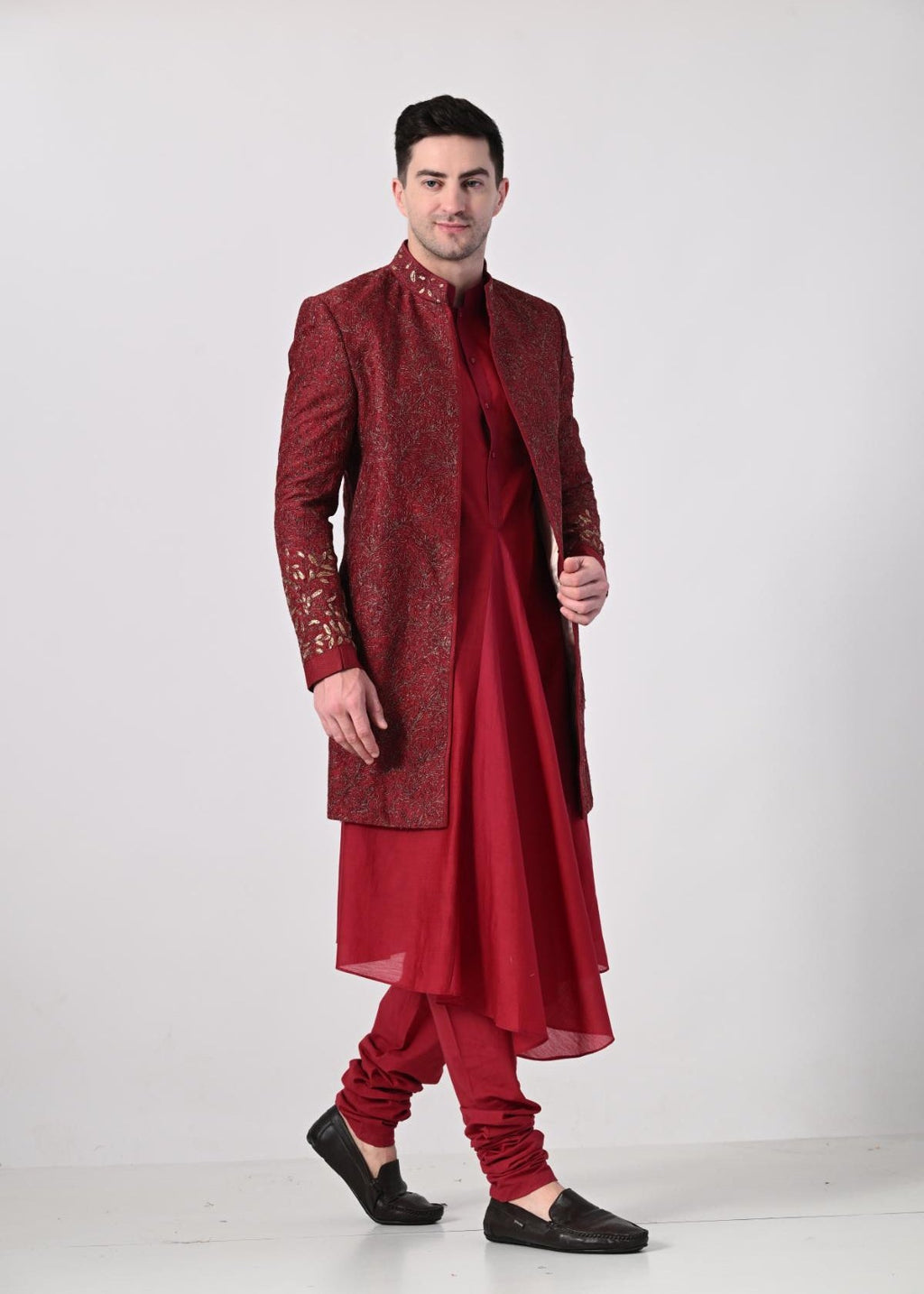 Make a lasting impression with this maroon Indo-Western outfit featuring a heavily embroidered sherwani jacket paired with a classic kurta and churidar. With intricate gold detailing and a regal silhouette, it's the perfect cho...