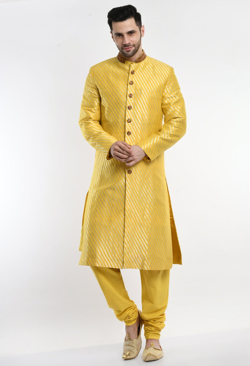 A yellow cotton silk sherwani showcasing silver diagonal line patterns and paired with a matching cotton churidar.