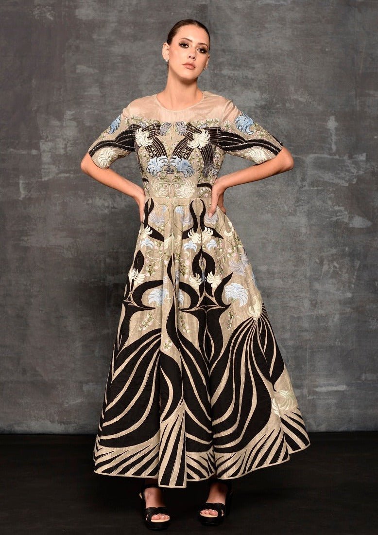 Modified cape sleeves fit & flare calf-length Ivory Cotton Silk Dress, embroidered in zari work.