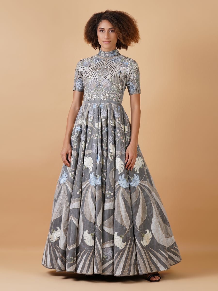 Featured here is a high-neck fit, A-line floor length gown in organza that is crafted with appliqué work and beautiful silk and zari yarn.