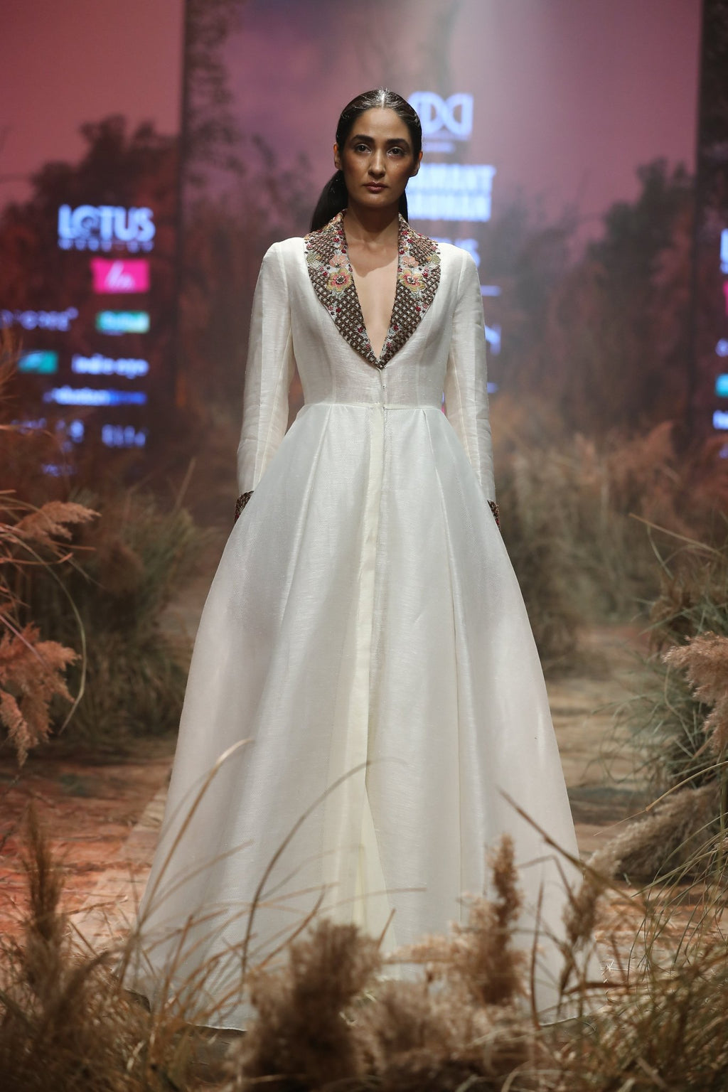 Ivory front-opening fit & flare asymmetric hemline organza silk gown embroidered in silk & zari yarn.