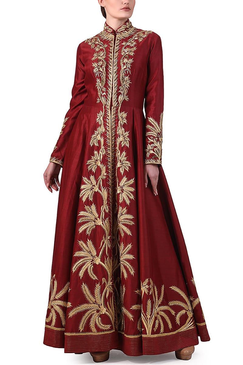 Maroon fit & flare kalidar Cotton Silk Kurta embelllished in silk & zari yarn.