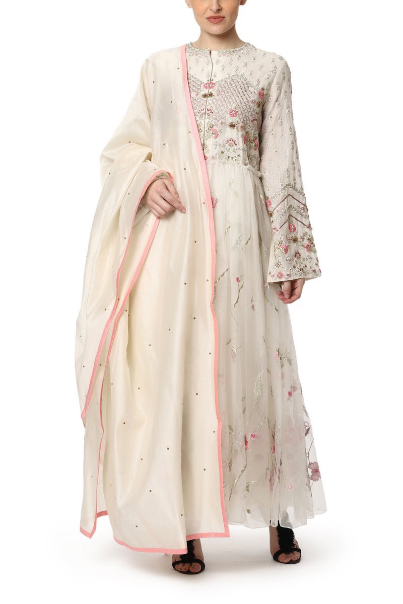 An off white floral embroidered rib chanderi silk and organza ankle length dress with chanderi silk dupatta