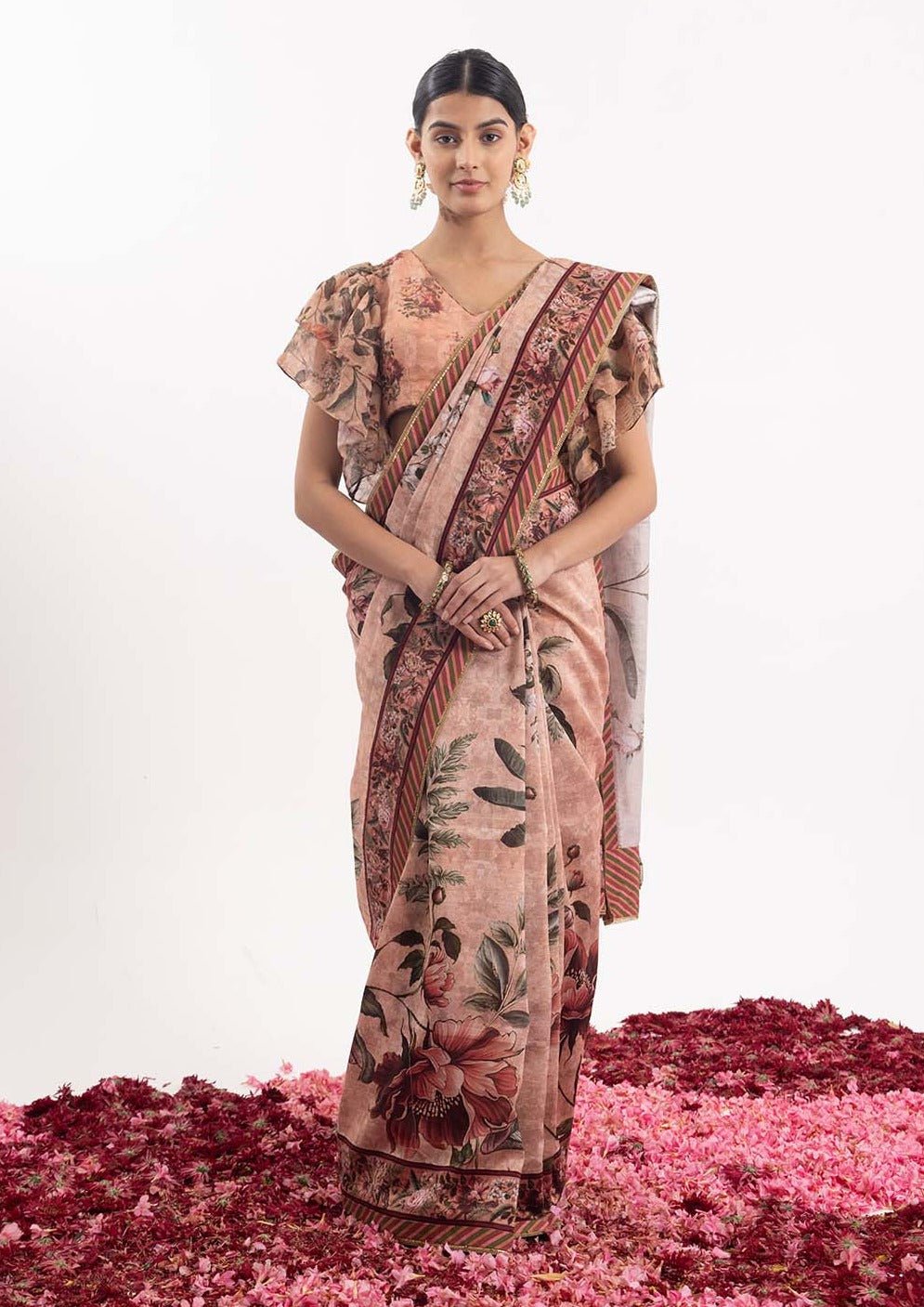 Featured here is a fully embroidered lehenga set in beige linen silk base that is topped with a matching crop jacket. The ensemble is beautifully embroidered in silk yarns, zardosi, pearl and sequins.