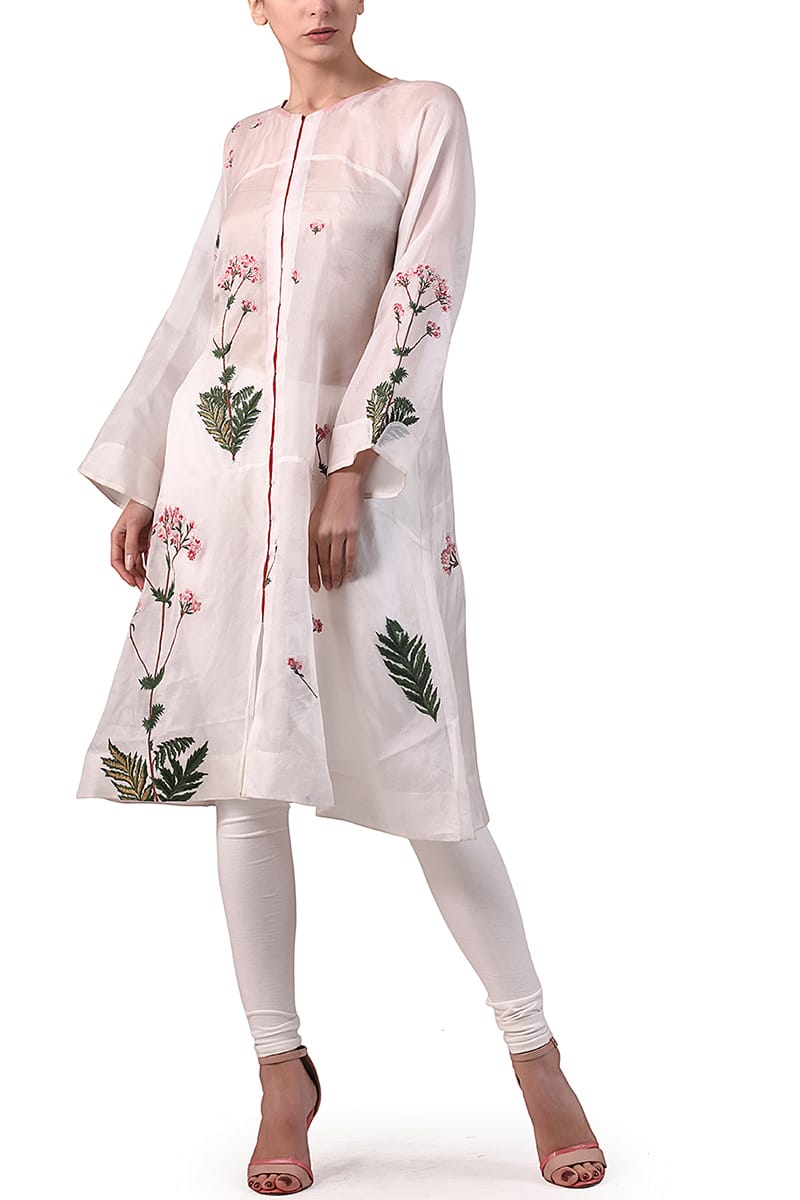 Ivory front-opening chudidar sleeves Cotton Silk Kurta with floral embroidery of silk yarn & highlighted with top-stitch detailing on the hem.