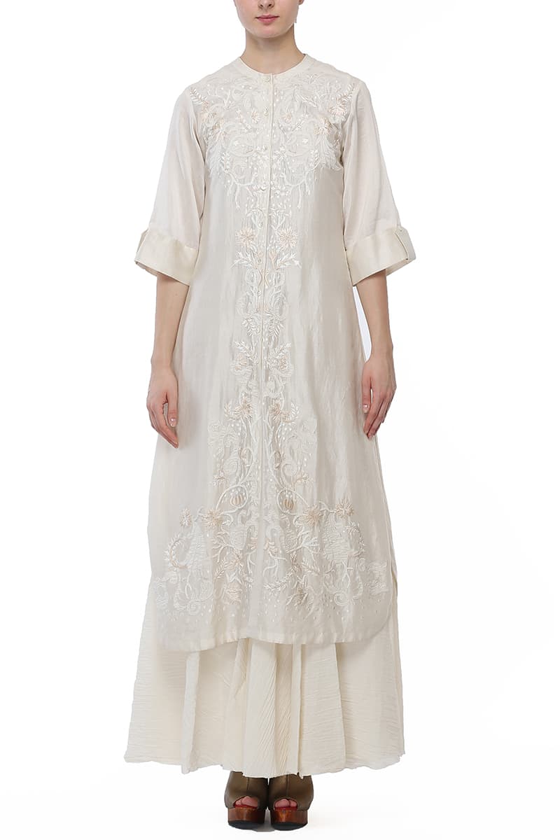 Ivory calf-length front button down Cotton Silk Kurta highlighted in tone-on-tone floral embroidery paired with an ankle-length Cotton inner.