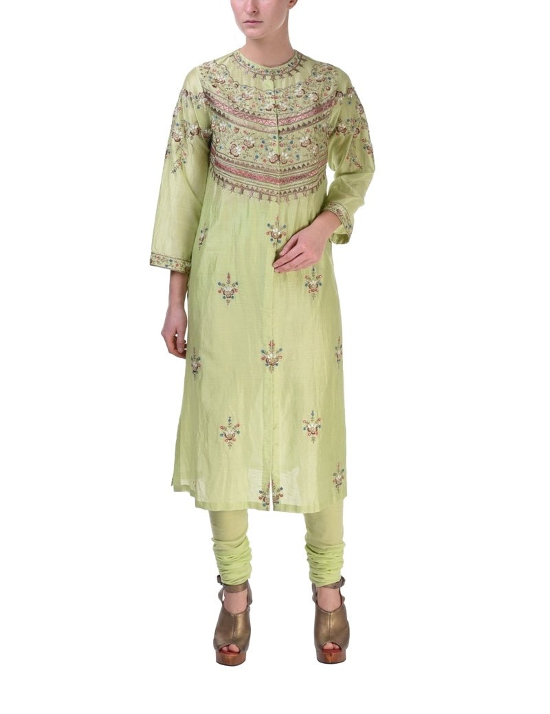Organza silk kurta with front-opening, embroidered floral motifs of silk & zari yarn.