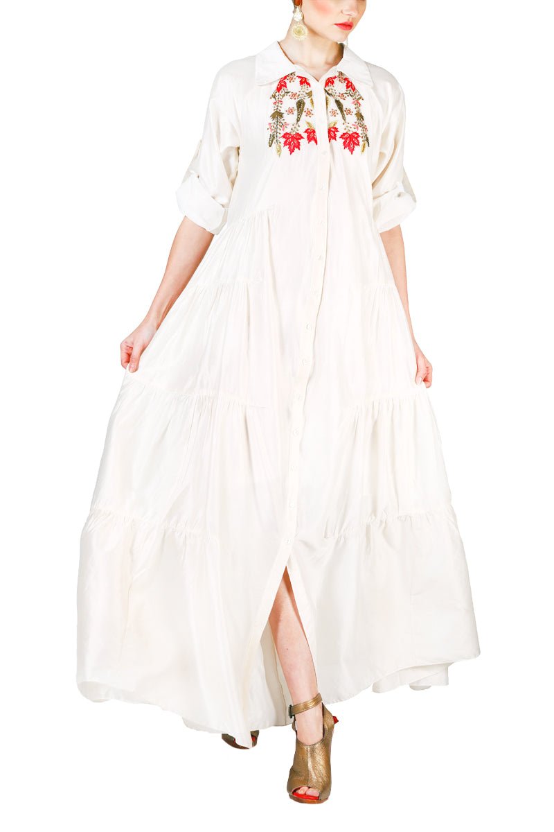 Featuring an ivory front-opening tiered shirt dress with silk yarn, zari, sequins & bead embroidery detailing.Color: IvoryFabric: Cotton SilkCare Instructions: Dry Clean Only.
