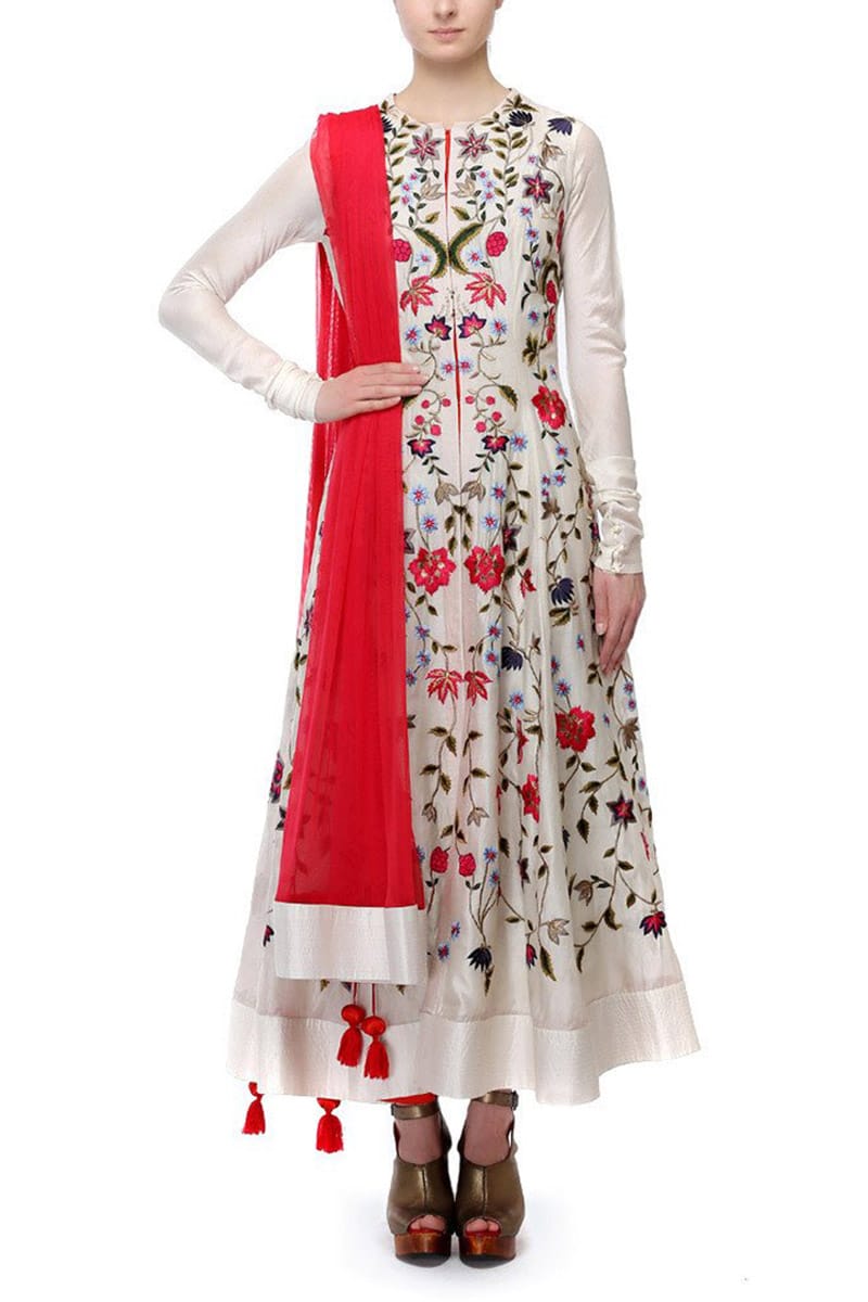 Ivory front-opening fit & flare peplum style organza silk gown highlighted with red taping & embroidered floral motifs of silk & zari yarn.Color: IvoryFabric: Organza SilkCare Instructions: Dry Clean Only