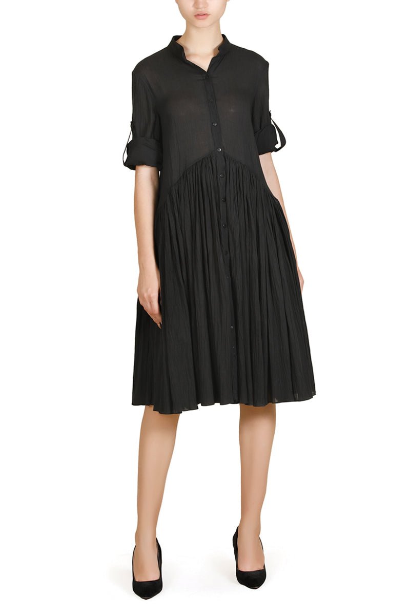 Featuring a Black front button-down dropped waist gathered Dress with roll-up sleeves detailing.Color: BlackFabric: Cotton ViscoseCare Instructions: Dry Clean Only.