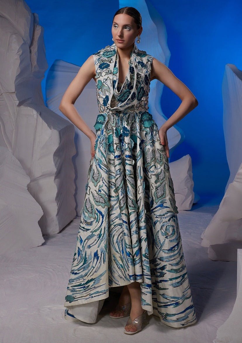 Chic ivory high-low hem gown with a cowl neckline, elegantly enhanced by silk thread and Zardozi embroidery.