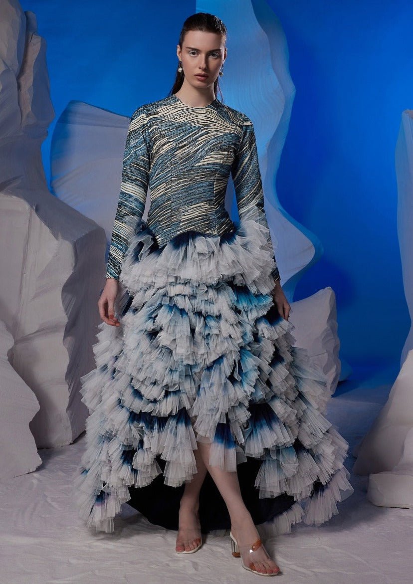 Silk thread embroidery high low hem gown with organza sleeves & box pleat at waist.
