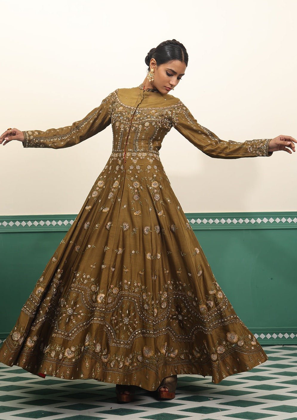 Full sleeves chanderi silk front open high neck dress adorned with intricate embroidery on both the front and back