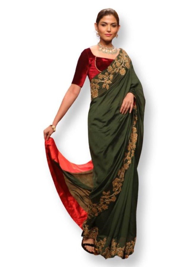 Green cotton silk saree that is adorned in gold French knot embroidery on the borders and is paired with a maroon velvet blouse that showcases golden piping.