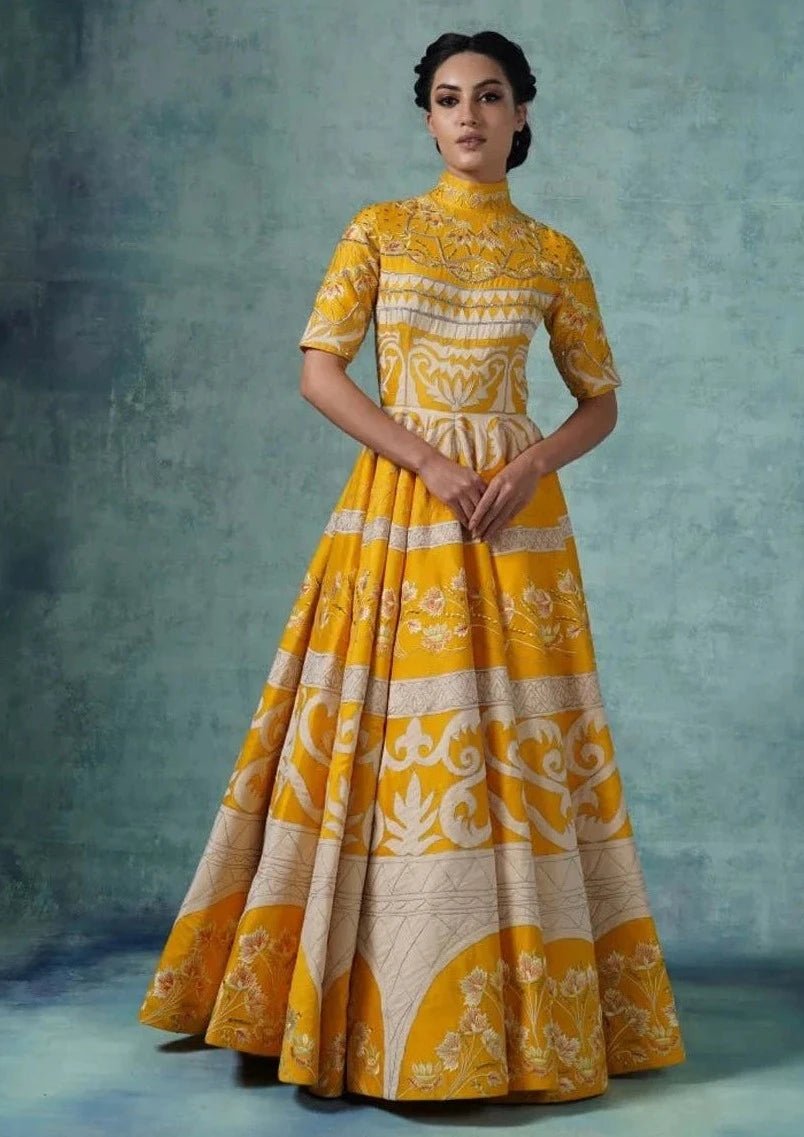 A high neck gown in yellow and white appliqué work and beautiful embroidery on Linen Silk base. The gown has a voluminous flair.