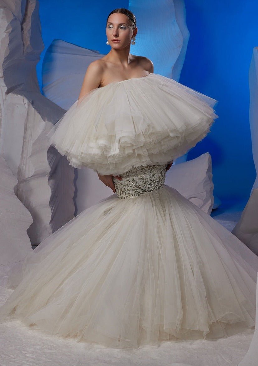 Ivory structured gown with a sculpted bodice and flowing layered panels. Features intricate pleating and minimal cap sleeves for a contemporary yet ethereal look.