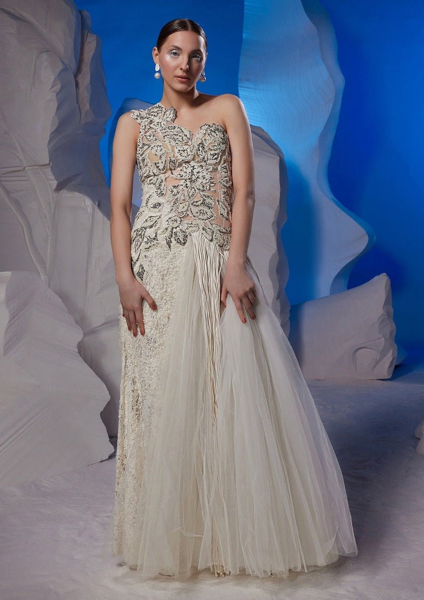Elegant ivory one-shoulder gown adorned with exquisite Zardozi embroidery.