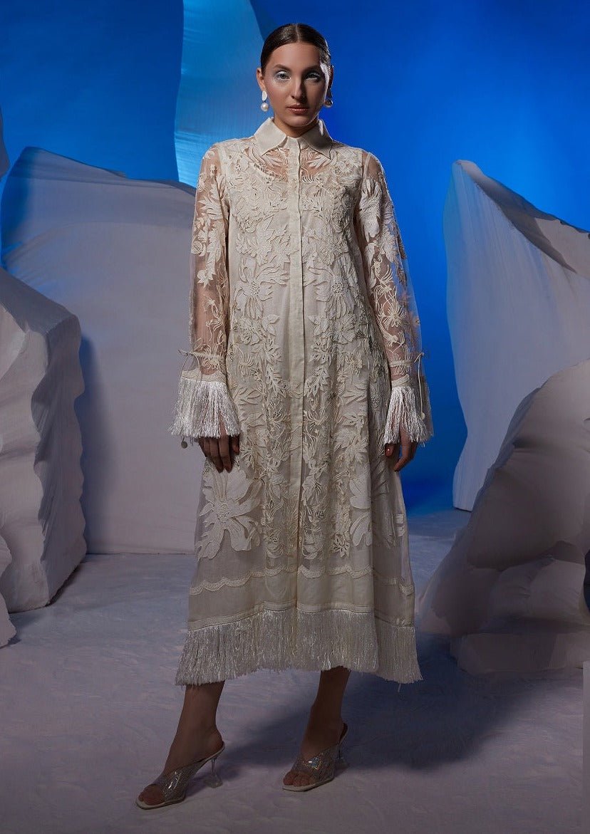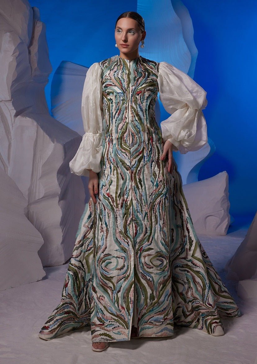 Ivory organza silk jacket dress with organic patch work and elegantly enhanced by balloon sleeves.