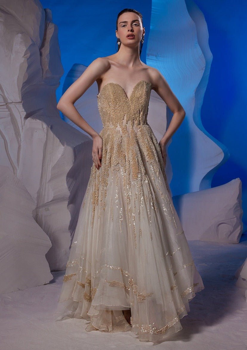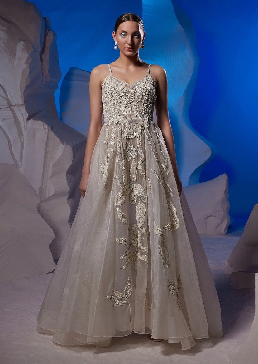 Ivory organza silk tube gown, enhanced with off-white loaded sequence work embroidery.