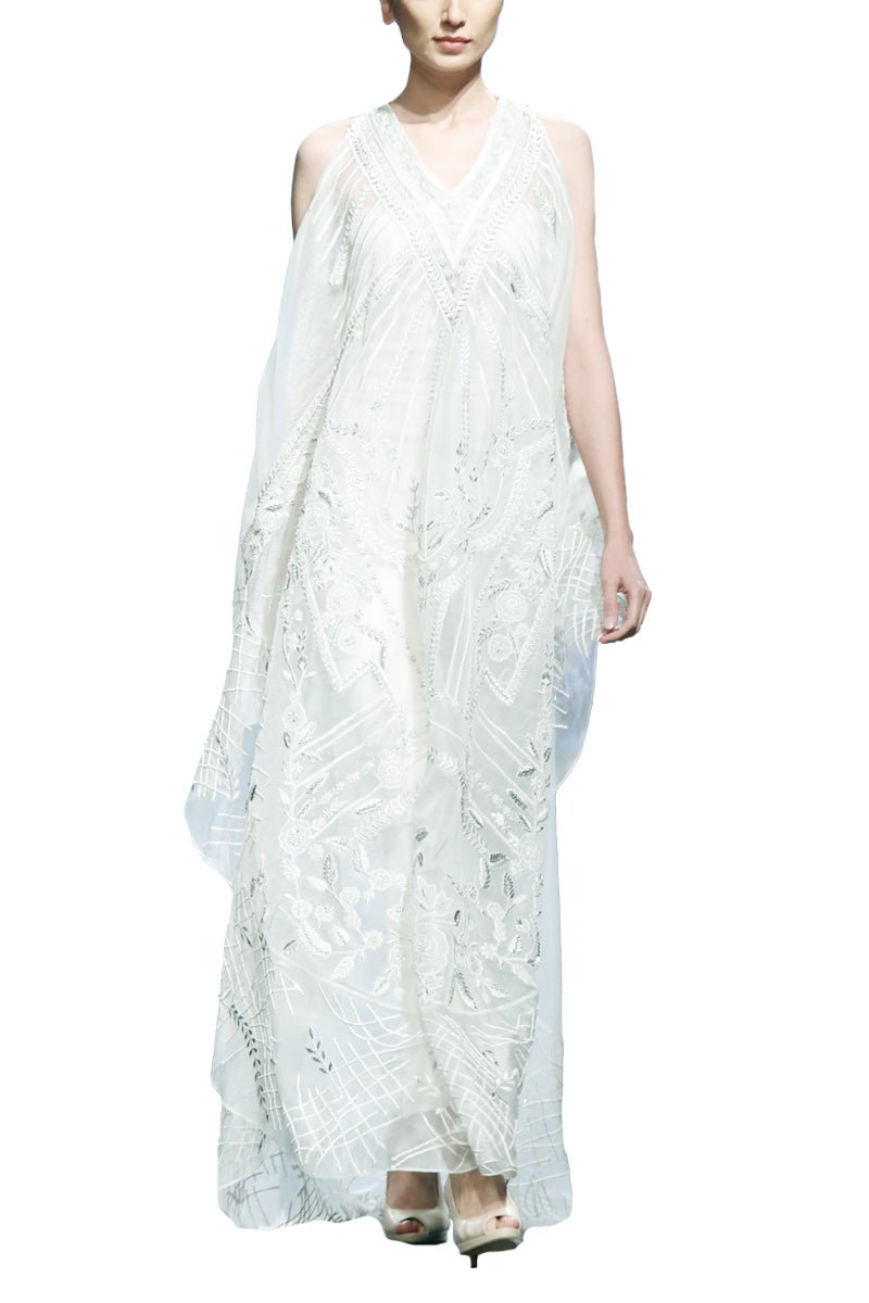 Ivory organza kaftan dress with cotton silk inner, elegantly enhanced with silver zardozi embroidery along the neckline.