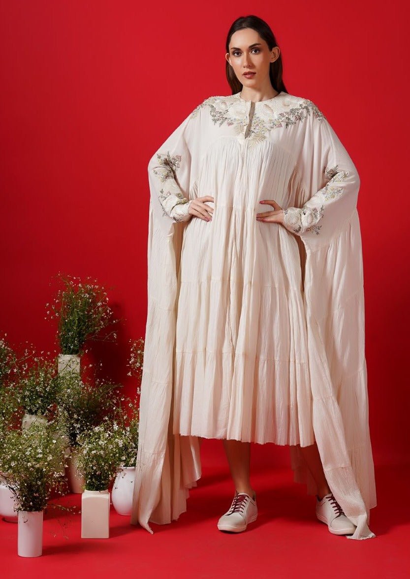Kimono sleeved, fit & flared, ankle-length Ivory Cotton Silk Dress, embroidered in silk & zari yarn.