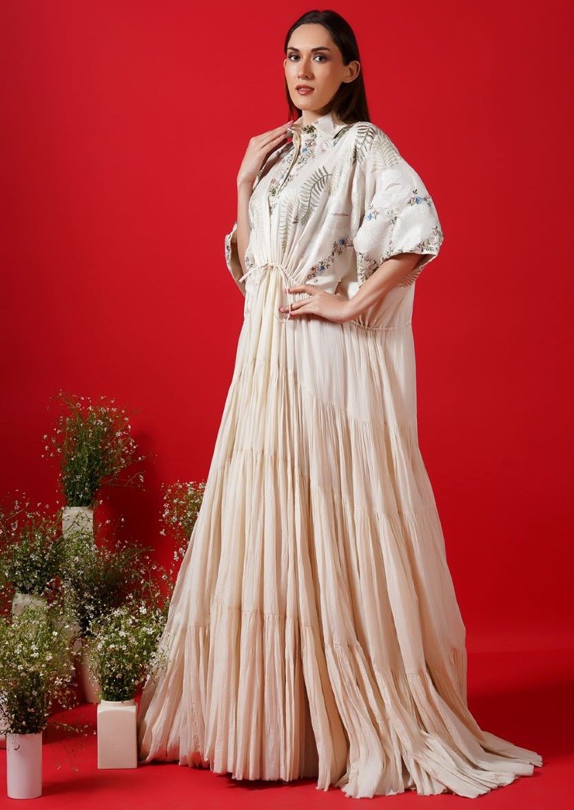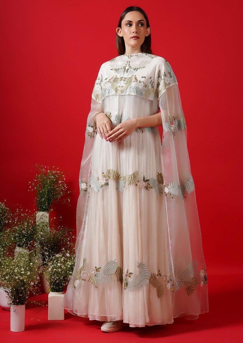 Ivory floor-length front open neckline & flare organza silk jacket with silver zardozi embroidery. Color: Ivory Fabric: Organza Silk Care Instructions: Dry Clean Only