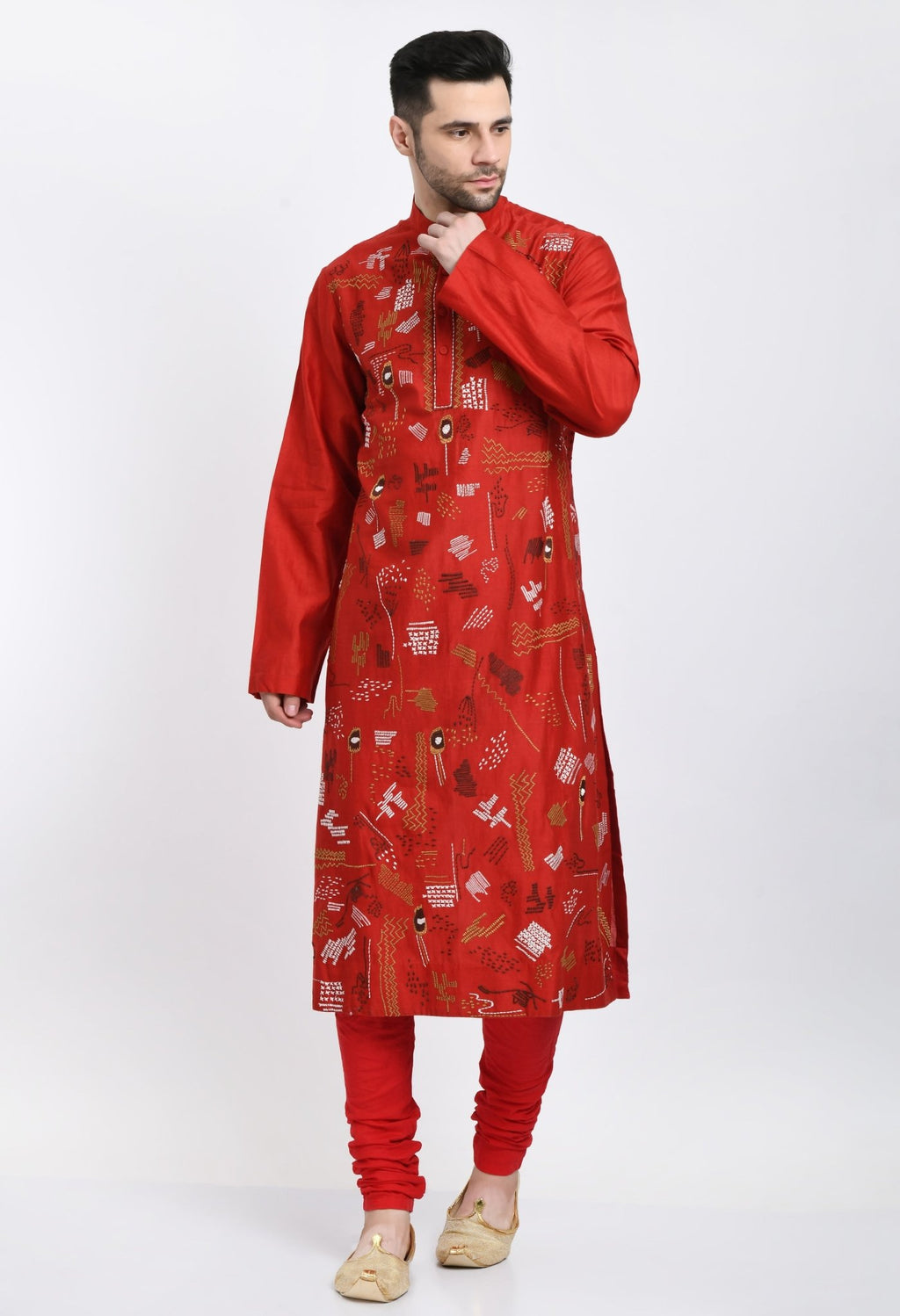 A cotton silk red kurta surfaced with intricate silk yarn embroidery is paired with matching cotton churidar.