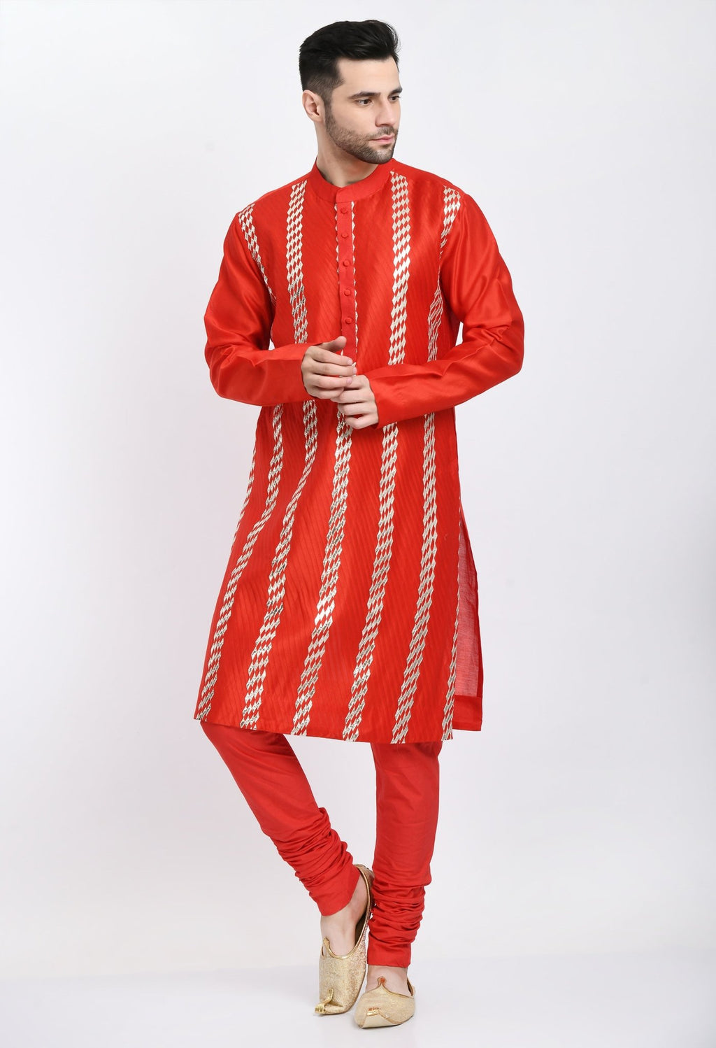 A cotton silk red kurta surfaced with silver pintux Gota work embroidery with matching cotton churidar.