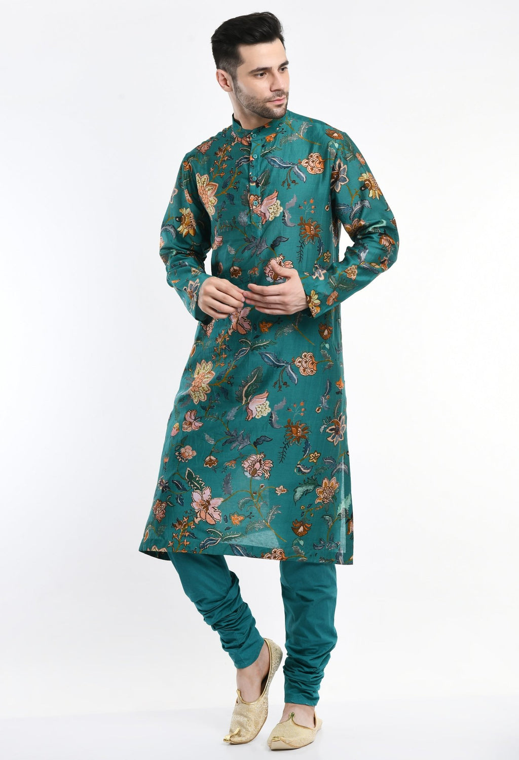 A cotton silk green kurta surfaced with digital print and paired with matching cotton churidar. The ensemble is topped with a waist coat which is surfaced with digital print.