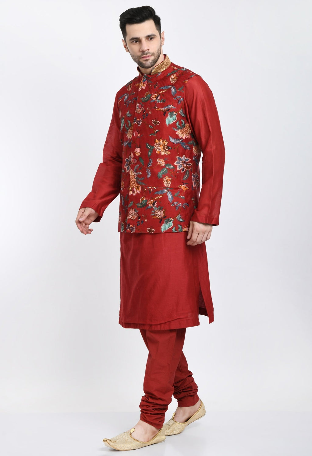 A cotton silk red kurta with matching cotton churidar that is topped with a reversible waist coat which is surfaced with digital print on red base and quilted texture.