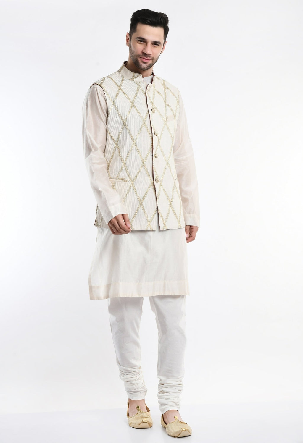 A cotton silk ivory kurta with matching cotton churidar that is topped with a reversible waist coat which is surfaced with digital print on red and quilted texture.