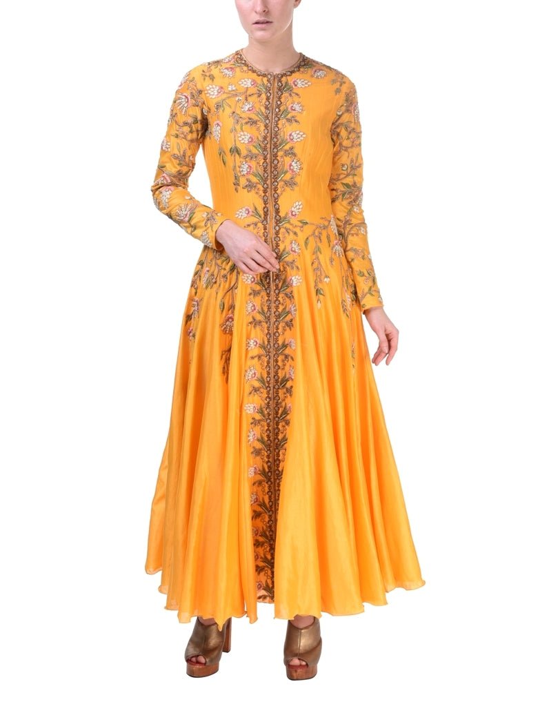 Featuring a mustard kalidar Kurta & dupatta with silk yarn, zari, sequins & beads embroidery.Color: MustardFabric: ChanderiCare Instructions: Dry Clean Only.