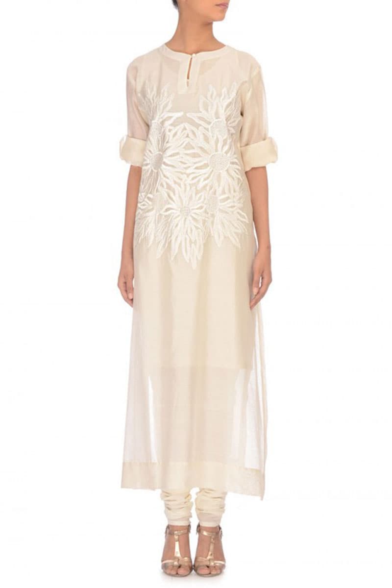 Ivory calf-length straight cut front keyhole opening Cotton Silk Kurta with floral motifs tone-on-tone embroidery.