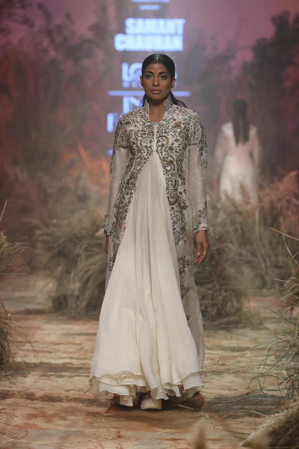 Ivory long cotton silk tiered Dress embroidered floral motifs of silk & zari yarn.Color: IvoryFabric: Cotton SilkCare Instructions: Dry Clean Only.