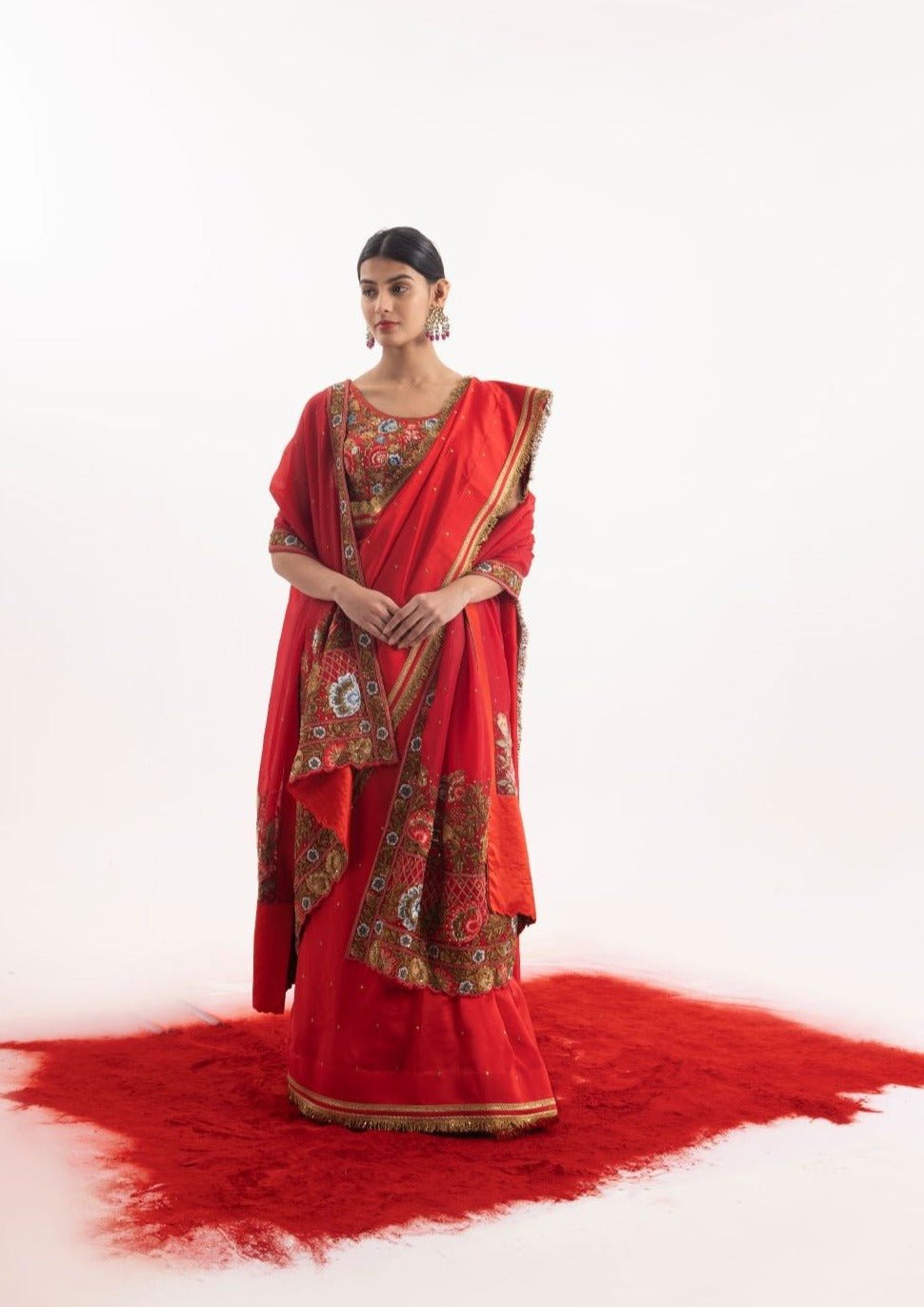 Luxurious 3-piece set showcasing a red embroidered saree crafted in sumptuous cotton silk fabric, complemented by an ethereal organza shawl for a perfect fusion of elegance and grace.