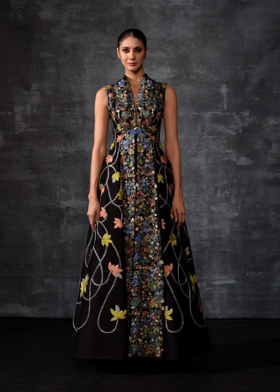 Make a bold statement in this sleeveless black gown, beautifully adorned with multicolored floral embroidery and a structured silhouette—where elegance meets artistic flair.