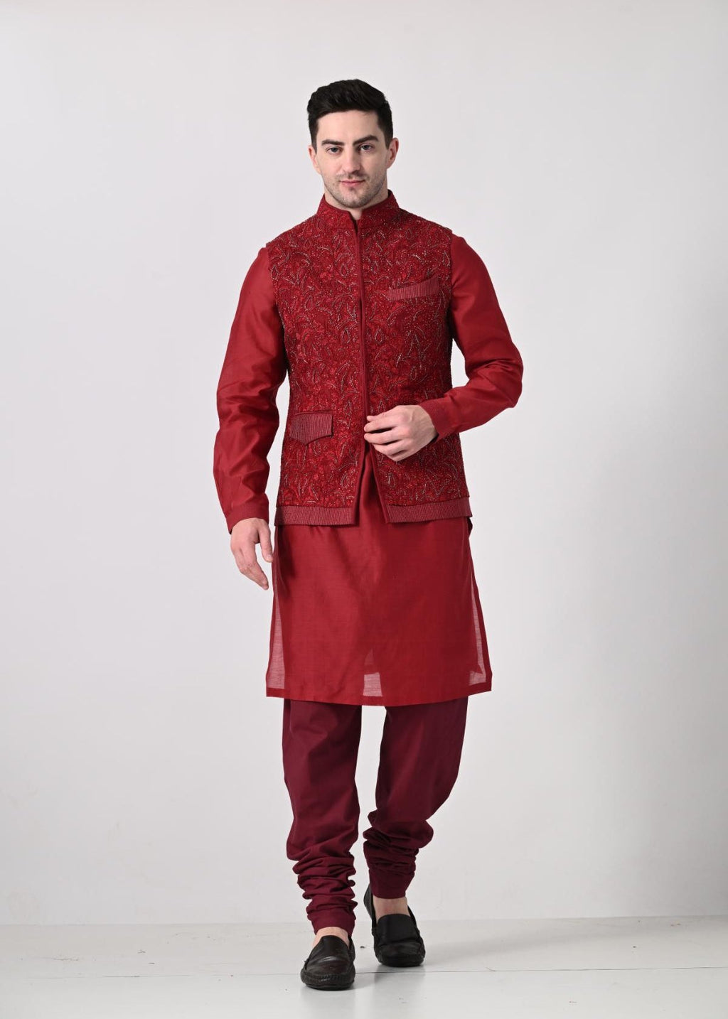 Elevate your ethnic style with this elegant maroon kurta set featuring a richly embroidered Nehru jacket. Crafted from premium fabric, the ensemble offers a perfect blend of traditional charm and modern sophistication—ideal for...