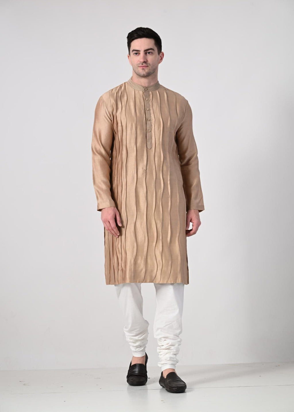 Step into elegance with this beige kurta featuring a unique vertical wave-textured design. Made from a lustrous fabric for a refined finish, it includes a mandarin collar and buttoned placket. Paired with a classic white churid...