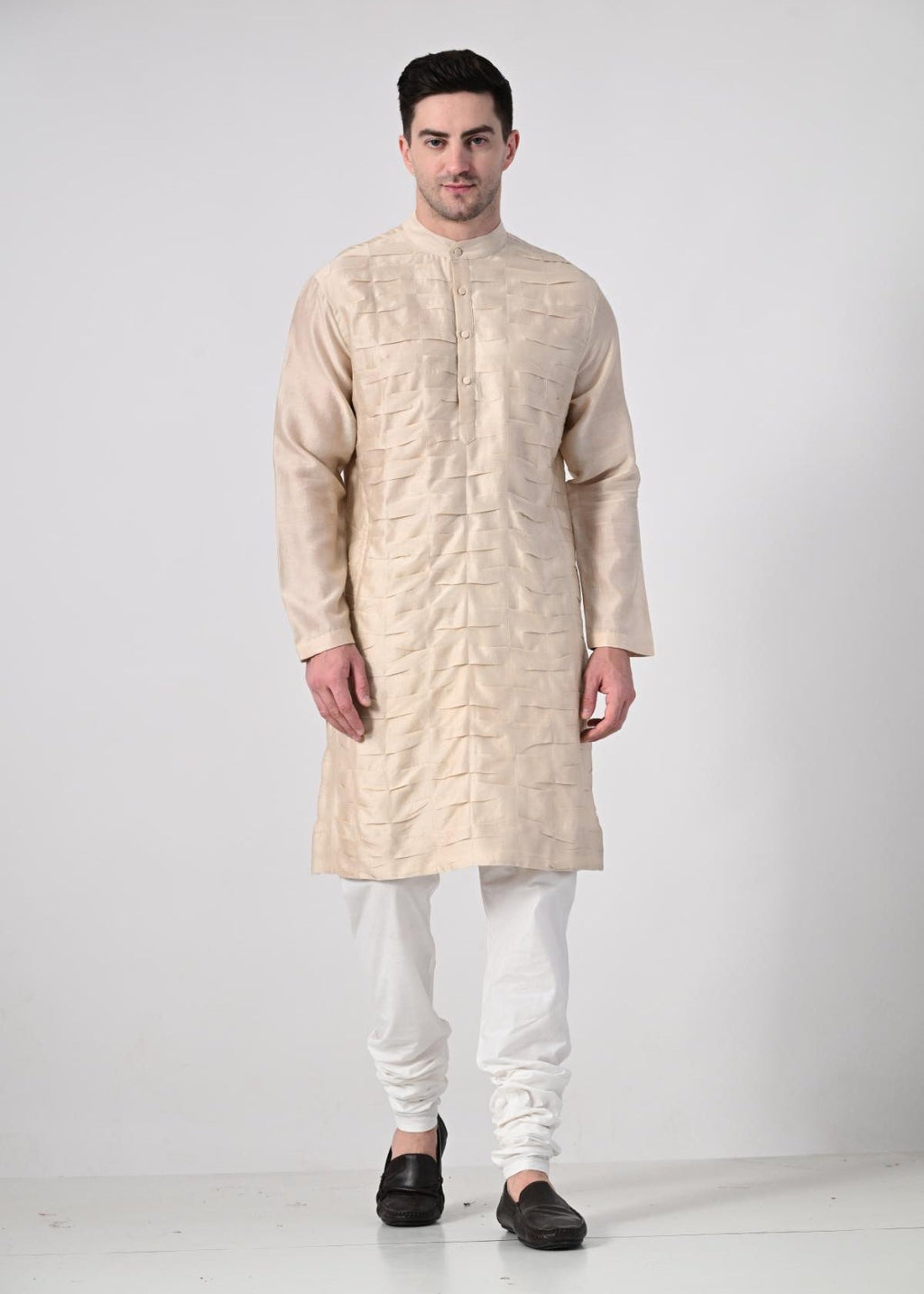 cream-colored kurta, designed with an elegant textured pattern for a refined touch. Featuring a mandarin collar and buttoned placket, it offers a perfect blend of tradition and style. Paired with a white churidar, it’s ideal fo...
