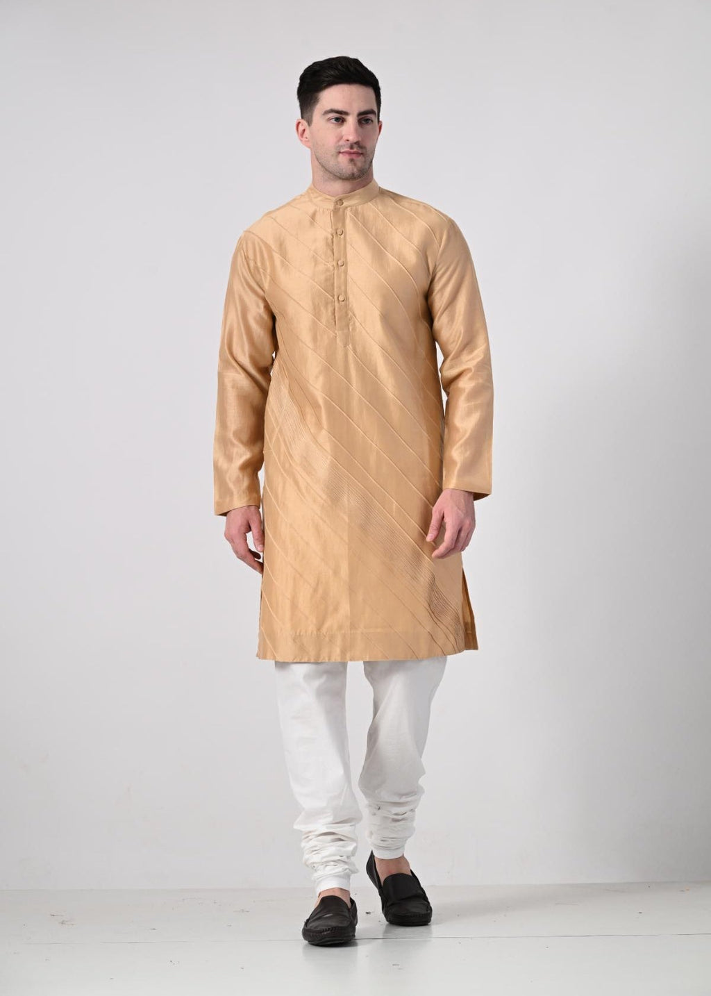 Add a contemporary touch to your ethnic collection with this golden beige kurta, featuring elegant diagonal textured patterns. Designed with a mandarin collar and button placket, it exudes sophistication and charm. Paired with ...