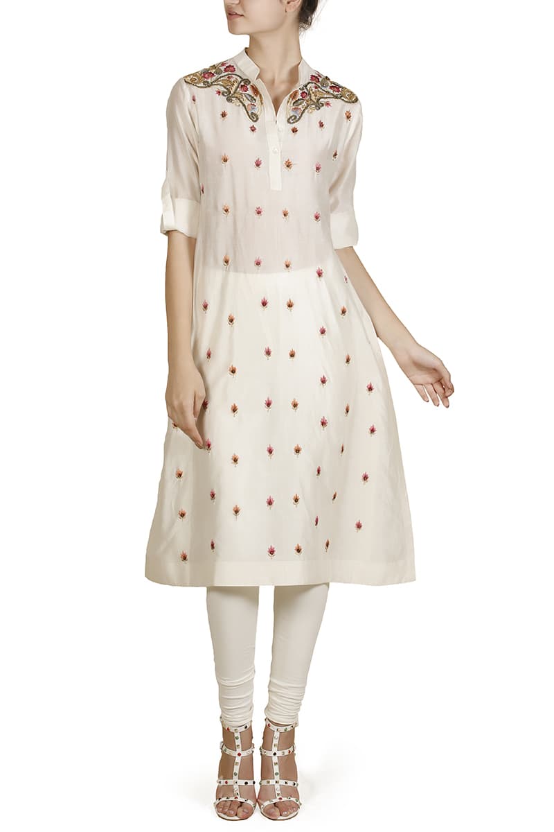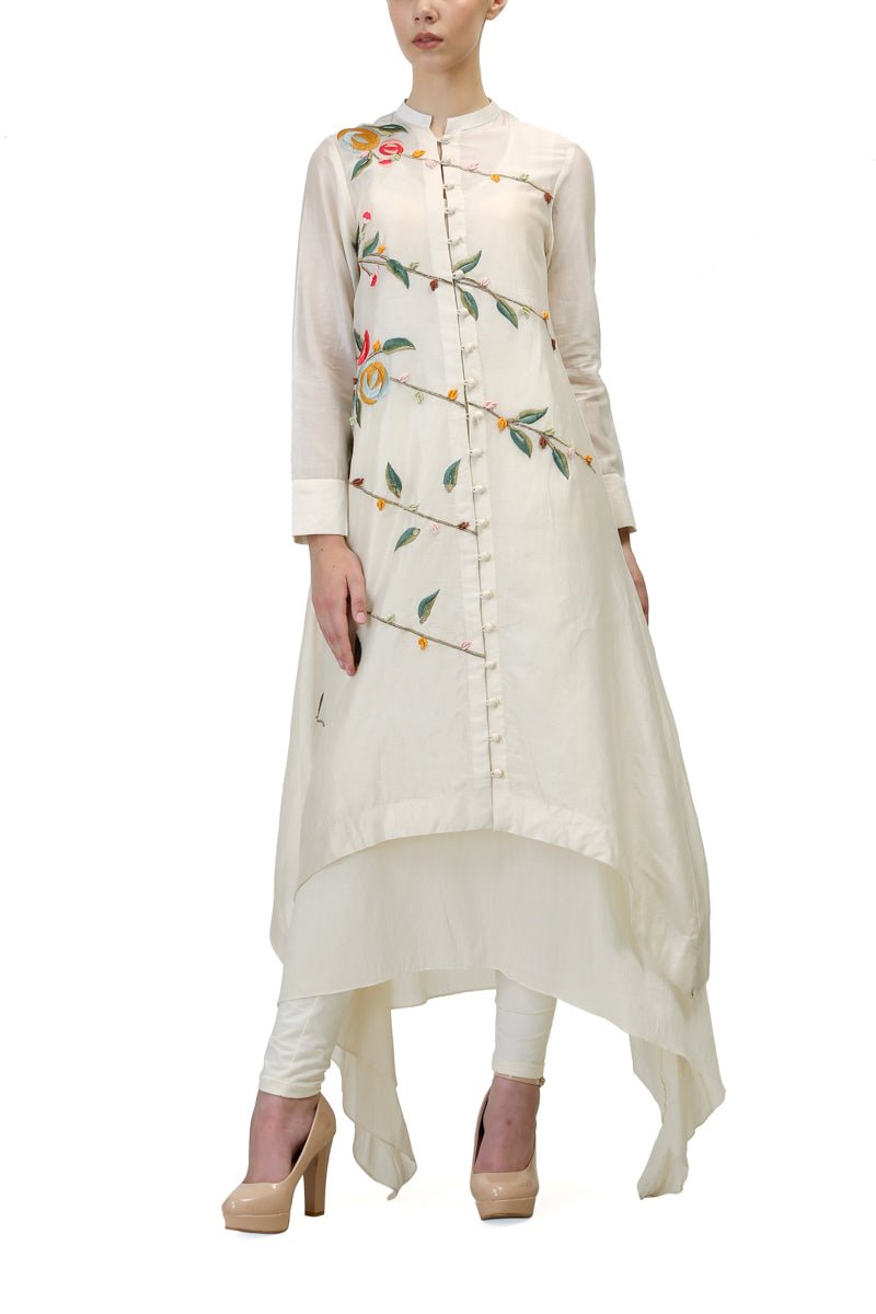 Featuring an ivory mandarin collar front-opening floral embroidery cotton silk kurta.Color: IvoryFabric: Cotton SilkCare Instructions: Dry Clean Only.