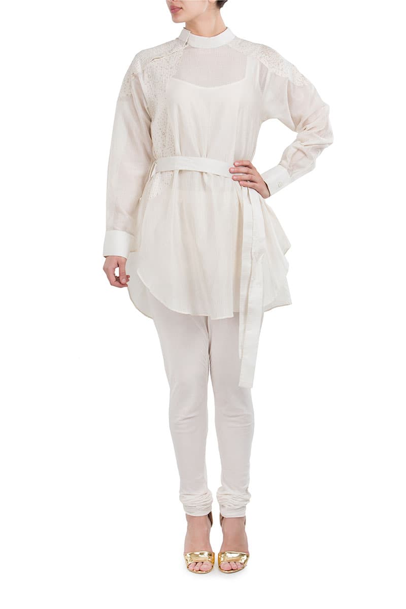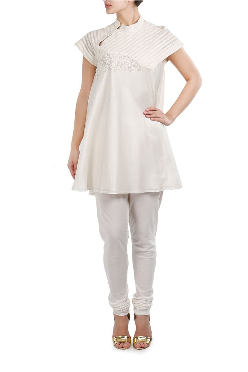 Ivory mandarin collared shoulder-opening belt tie-up back pleated cotton silk short kurta, yoke detailing with burnt effect.